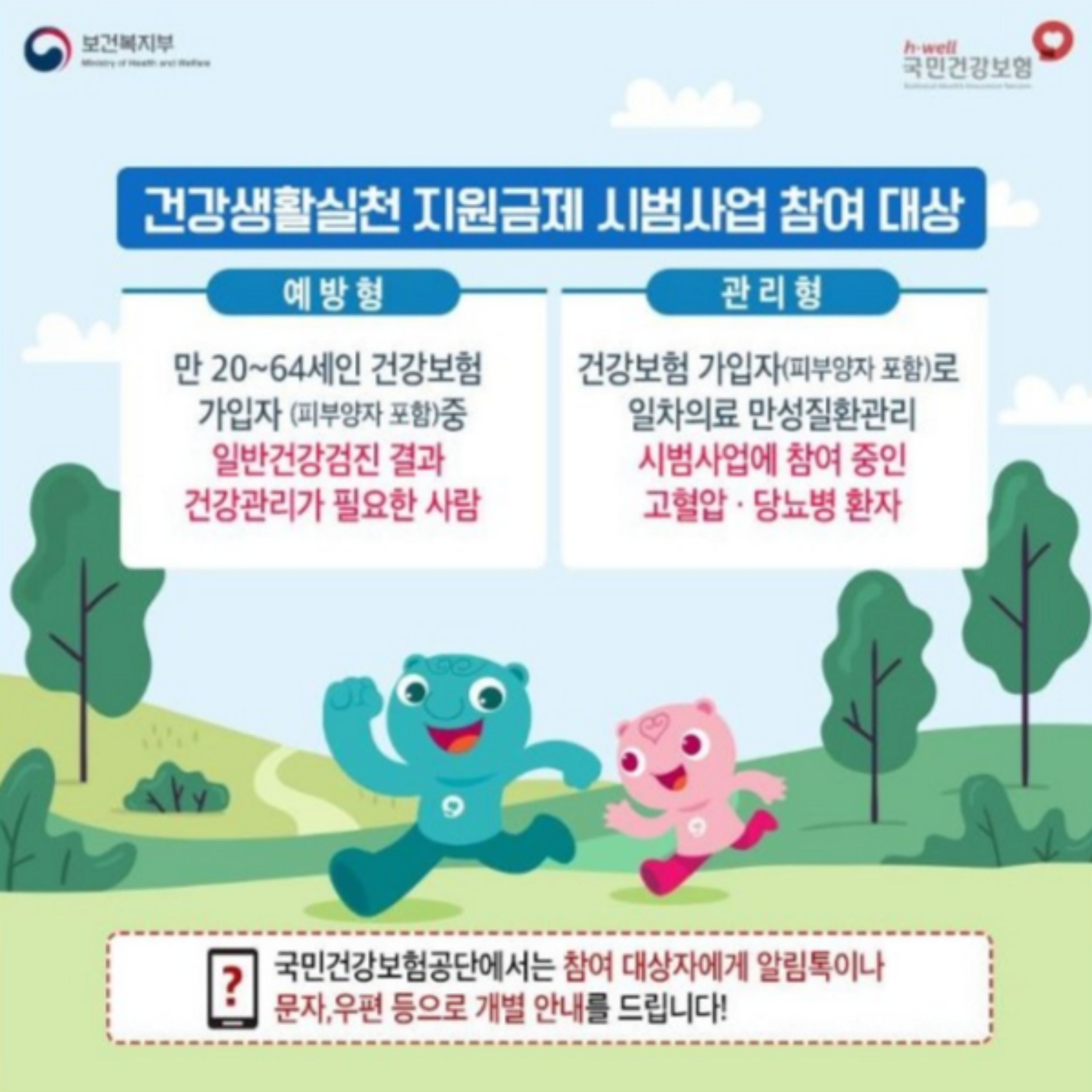 건강생활 실천 지원금제는 2024년 6월 30일까지 운영됩니다. 남은 신청 기간이 얼마 되지 않으니, 아래에서 내용 확인하시고 빠르게 신청하시기 바랍니다. 건강생활 실천 지원금제는 보건복지부와 건강보험공단에서 시행하고 있는 사업입니다. 관리형과 예방형으로 구분되어 있으며, 다양한 정부 지원금과 함께 받을 수 있으니 놓치지 마시기 바랍니다.
