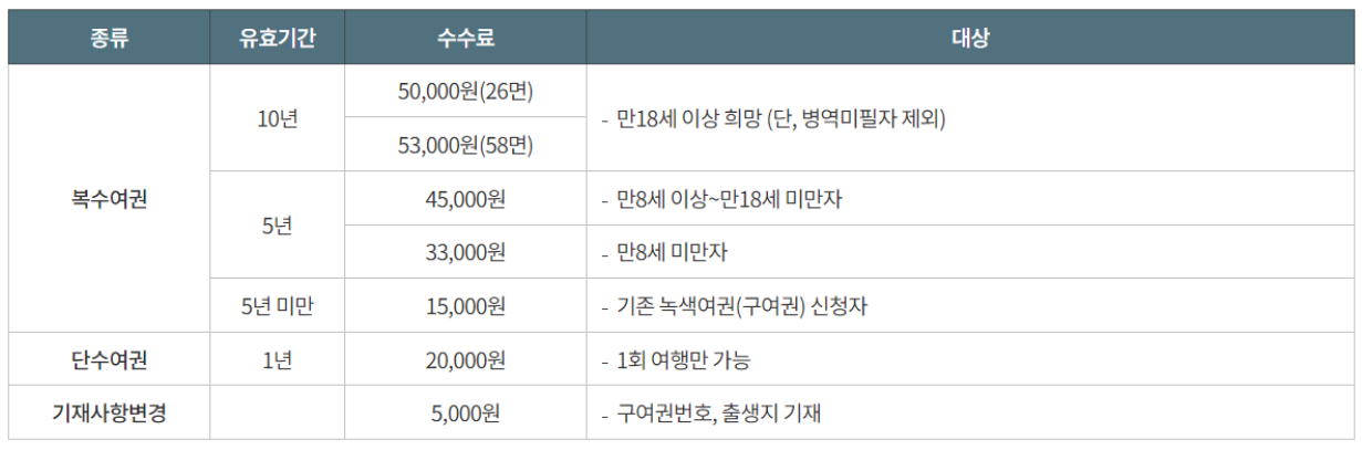 - 신청 장소: 전국 여권사무소, 우편, 해외 공관