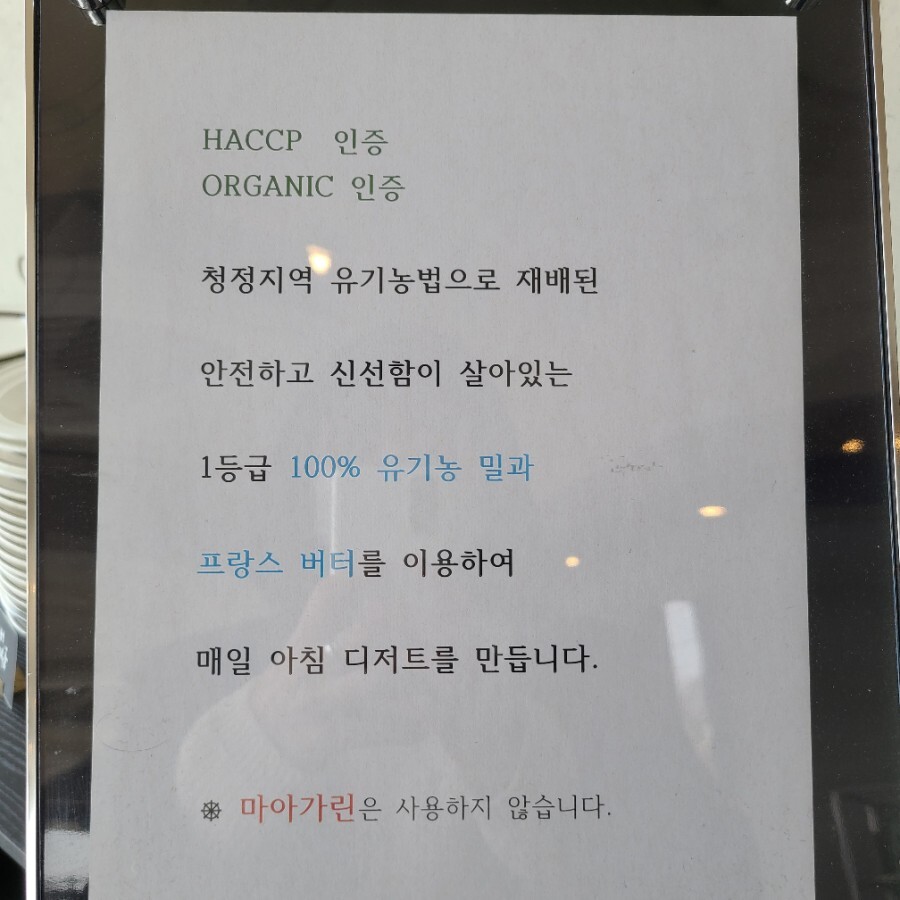 청정지역 유기농법으로 재배된 안전한 1등급 100% 유기농 밀과 프랑스 버터를 이용하고 있다고 합니다.