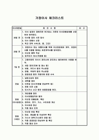 - 새 집 준비: 새 집의 청소, 인터넷 및 전기/수도 신청, 주소 변경 등을 준비합니다.